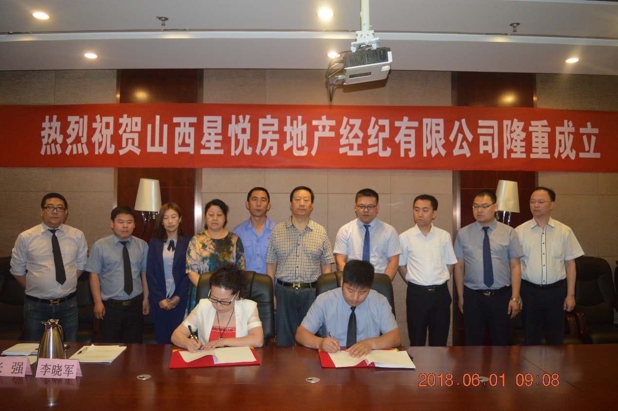 2018年6月1日上午9時,“山西星悅房地產(chǎn)經(jīng)紀(jì)有限公司成立大會暨簽約儀式”在星雅名都酒店4樓會議廳隆重舉行。集團(tuán)董事長總裁郭秀忠、副總裁王文萍、郭雅維、董事長助理沈習(xí)寧、經(jīng)紀(jì)公司總經(jīng)理冉賢俊、監(jiān)事劉斌等領(lǐng)導(dǎo)出席了大會。