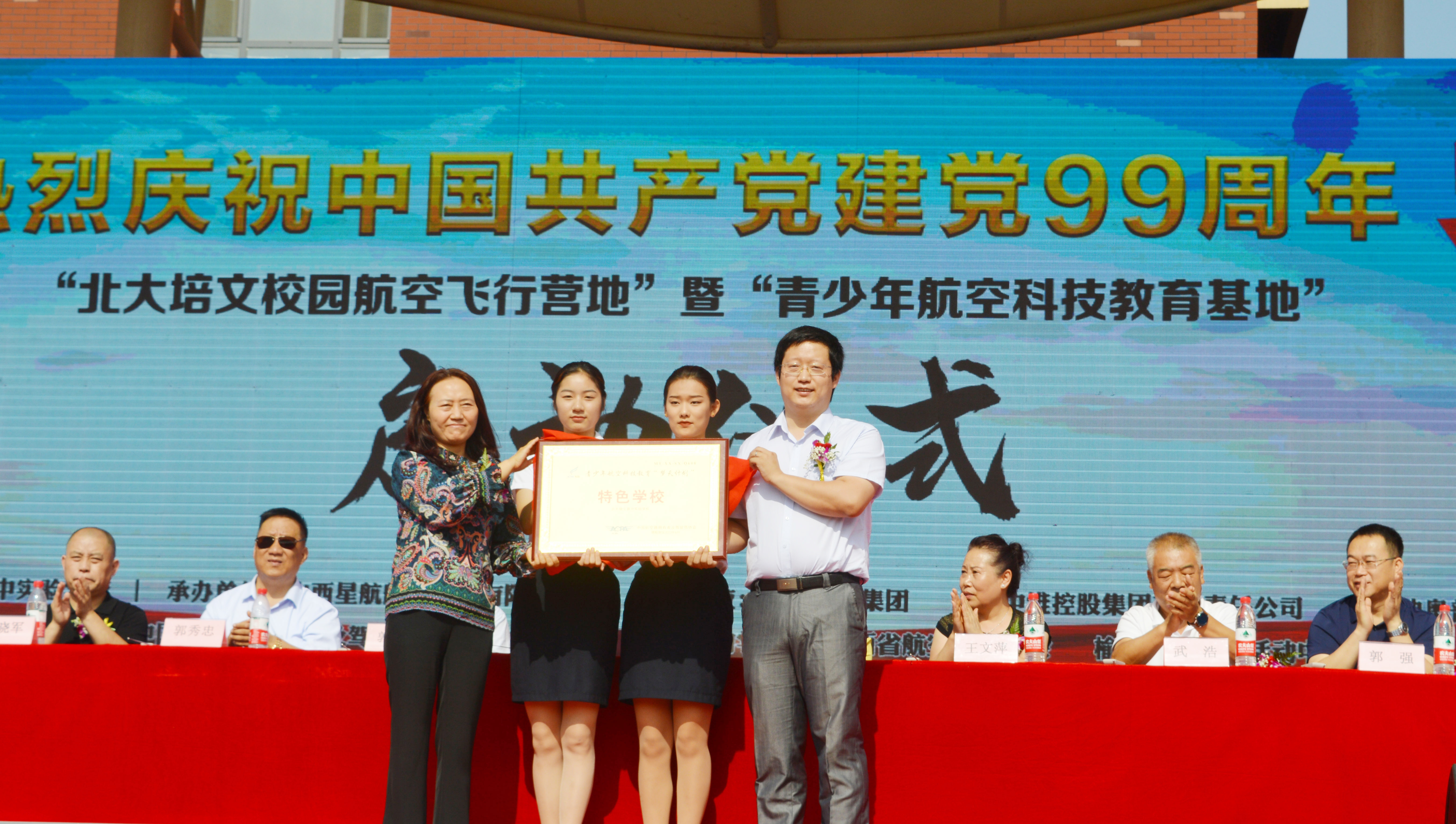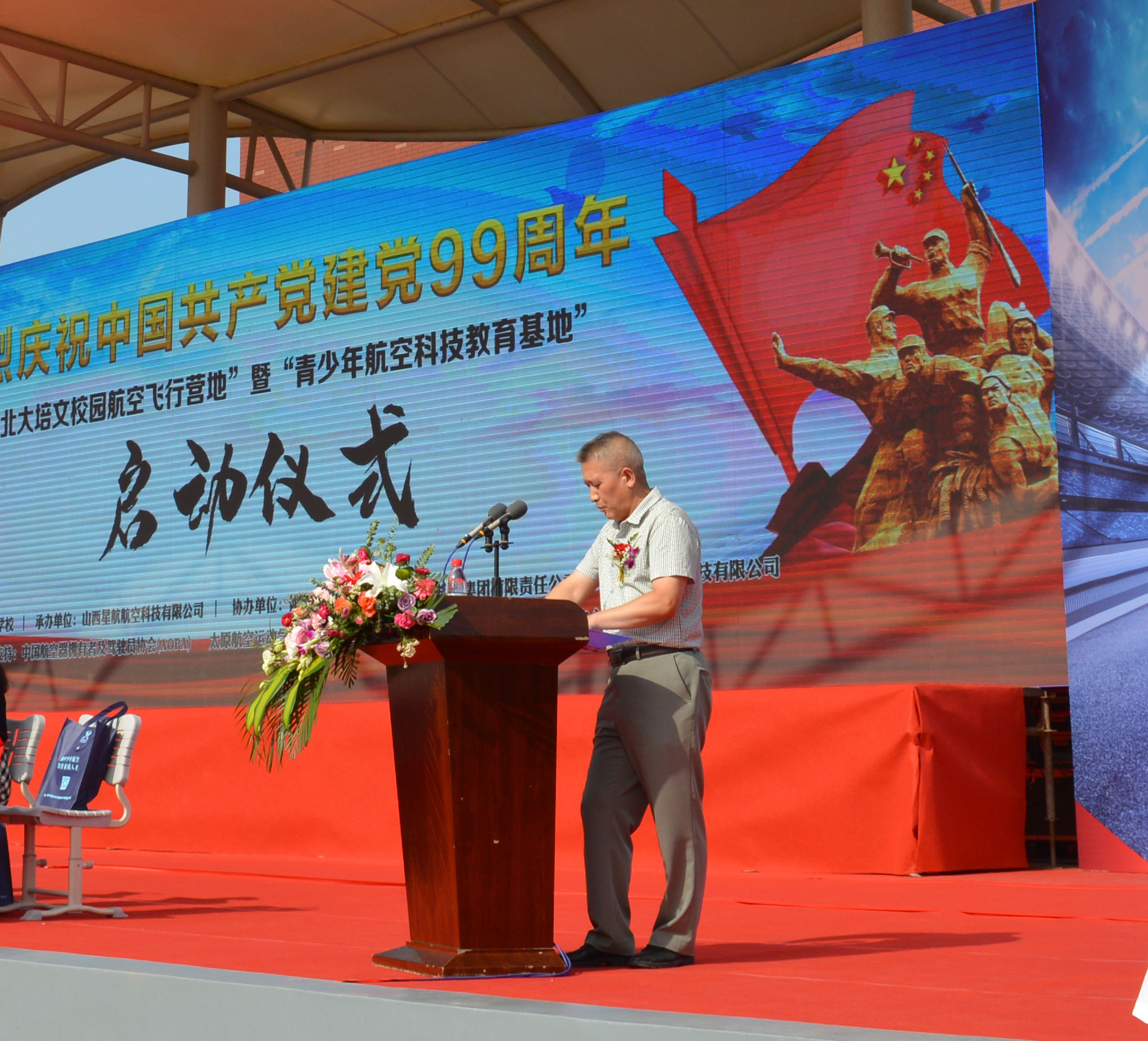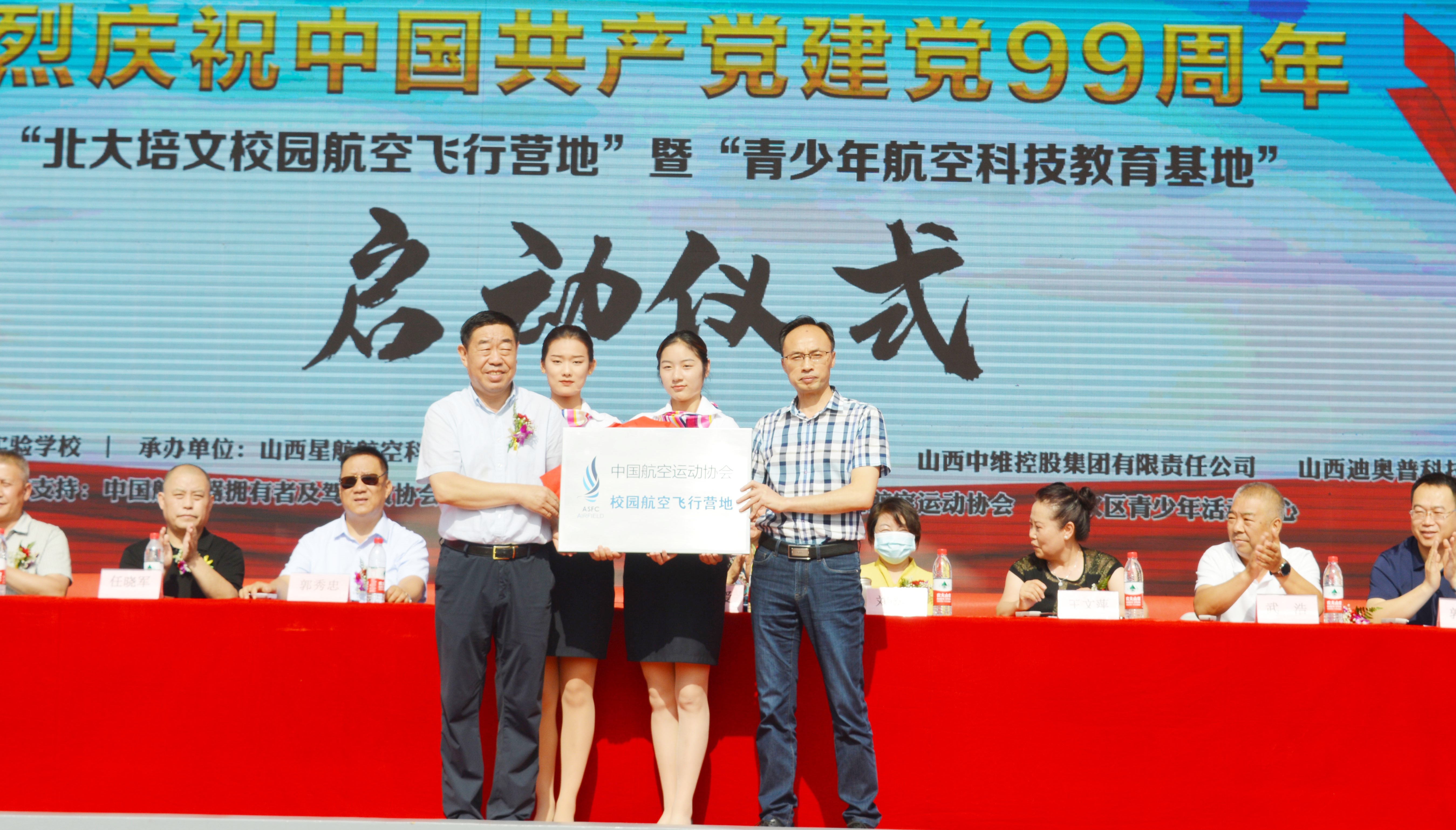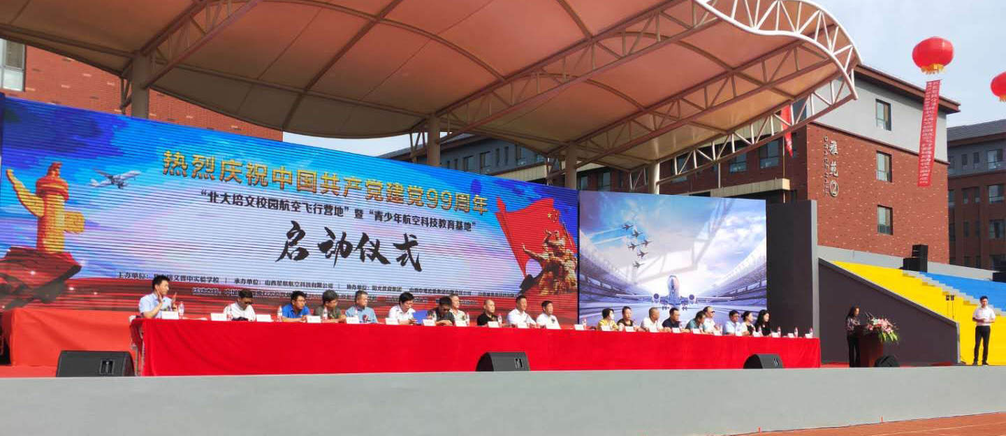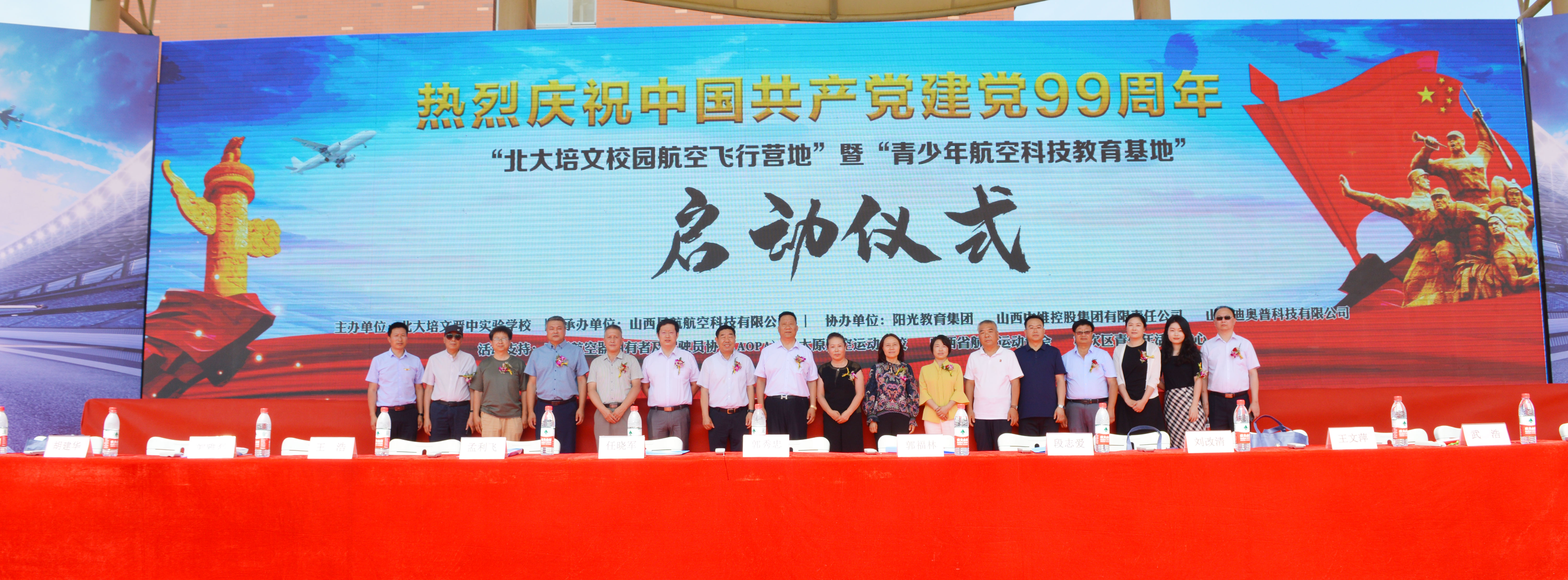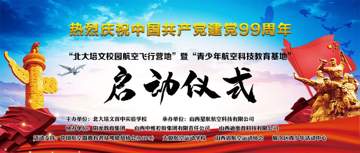 在中國共產(chǎn)黨誕辰99周年之際,為了進(jìn)一步培養(yǎng)青少年的航空愛國精神、全面推動(dòng)山西省航空特色教育發(fā)展,實(shí)現(xiàn)省通用航空產(chǎn)業(yè)的全鏈接。北大培文晉中實(shí)驗(yàn)學(xué)校于2020年7月1日上午八點(diǎn)隆重舉行了“校園航空飛行營地”暨“青少年航空科技教育基地”啟動(dòng)儀式。