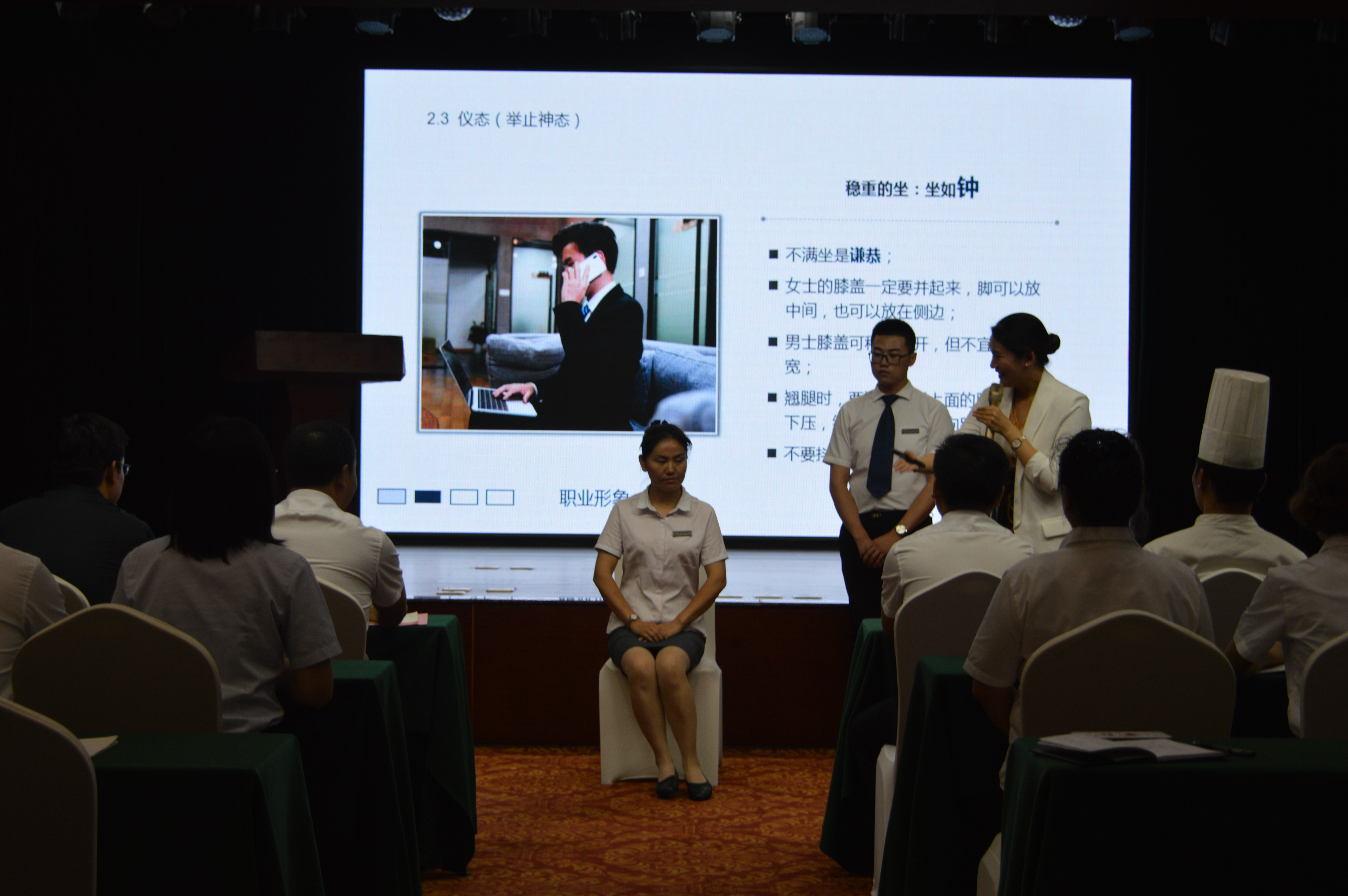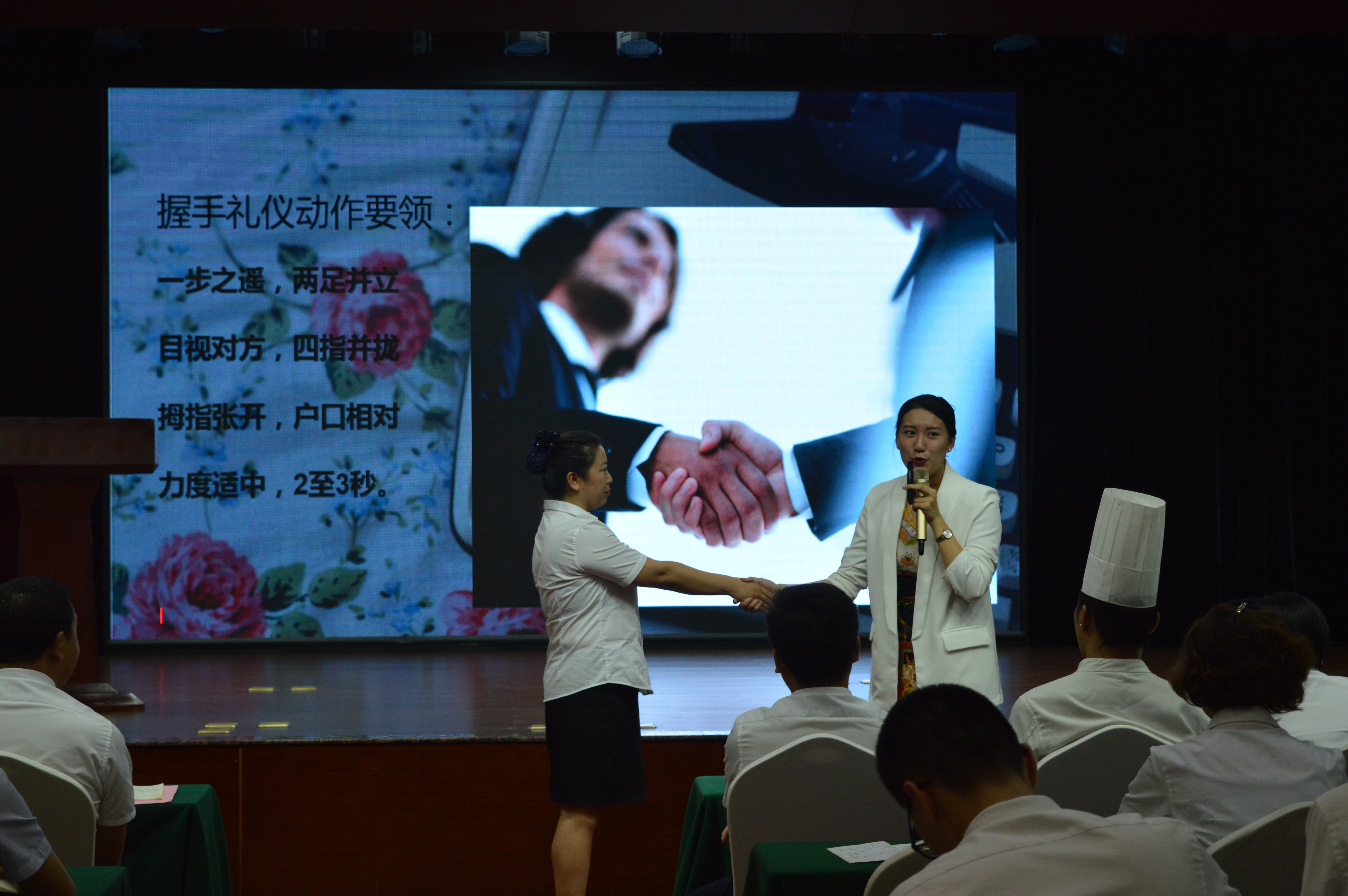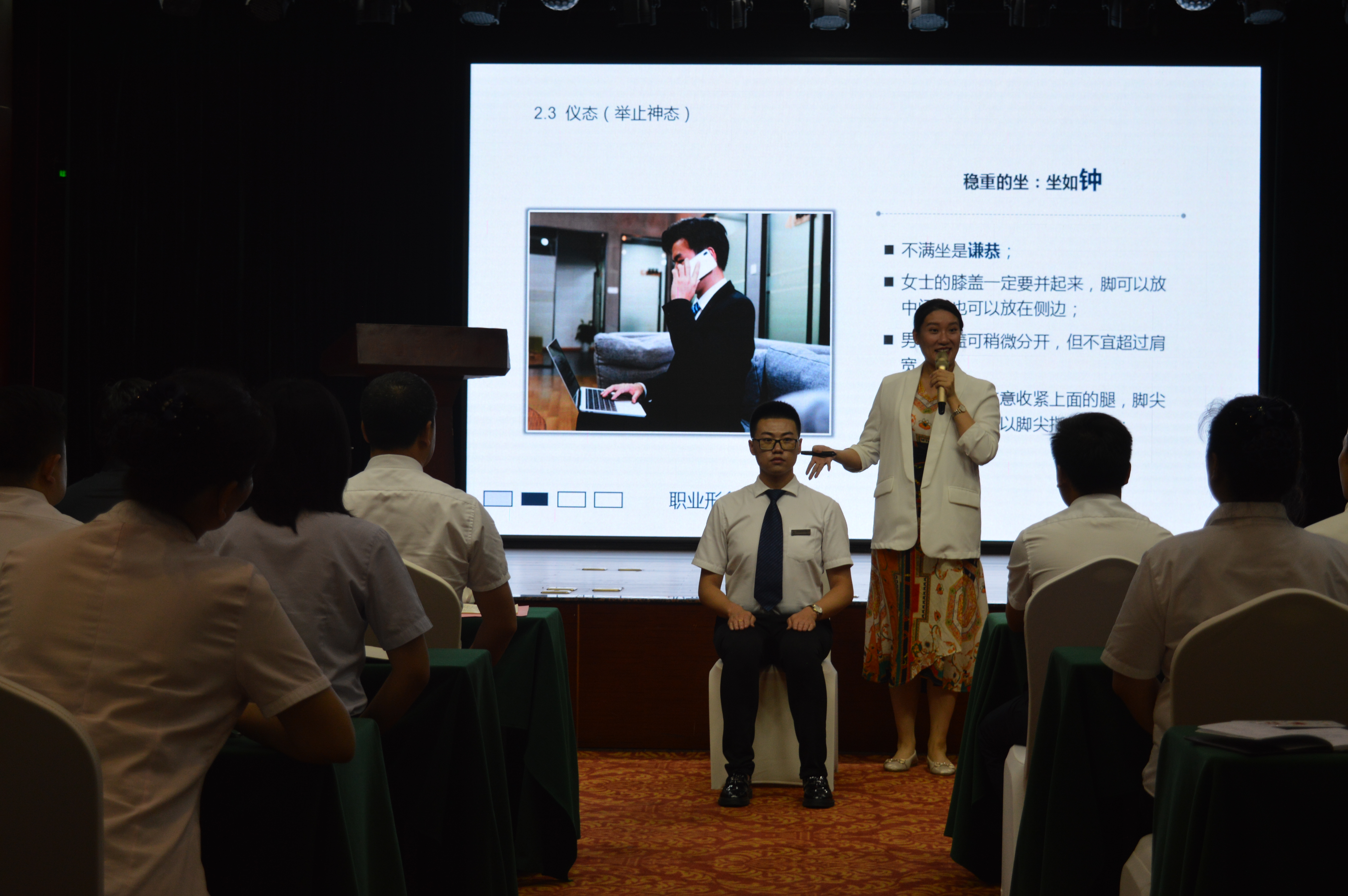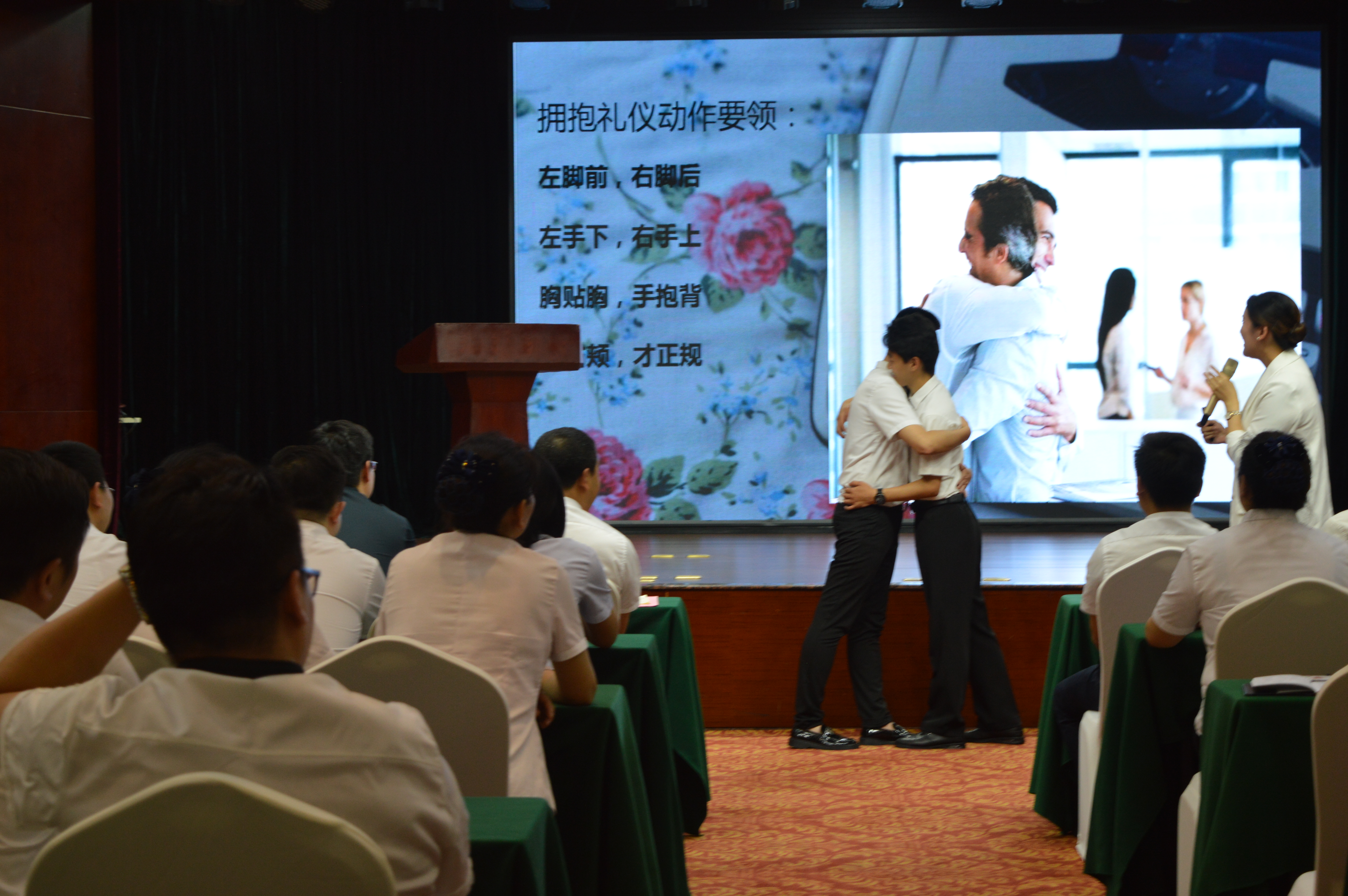 嘉賓曹老師為大家進行了精彩而生動的服務禮儀培訓,曹老師從日常的儀表、站姿、坐姿、行走、擁抱、握手、鞠躬等禮儀規(guī)范方面,邀請現(xiàn)場員工互動參與并示范講解,另外通過案例與影片分享,闡釋了服務美學的重要意義,以及如何從基本的服務到滿意的服務再到感動的服務?,F(xiàn)場教學氛圍活躍,精彩處引發(fā)陣陣掌聲。